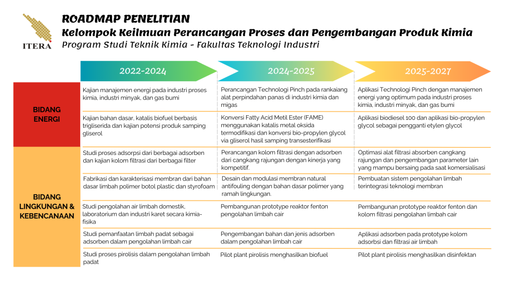 Kelompok Keilmuan Perancangan Proses dan Pengembangan Produk Kimia (KK Produk Kimia) merupakan salah satu bidang ilmu dalam keilmuan teknik kimia yang berfokus pada desain dan pengembangan proses produksi produk-produk kimia. Kelompok keahlian pengembangan dan perancangan proses dan produksi biologi Teknik Kimia ITERA memiliki beberapa bidang spesifik yang mencakup ilmu-ilmu proses pemisahan dan pemurnian, sintesis produk, simulasi proses belajar dan kamputasi, serta intensifikasi proses.